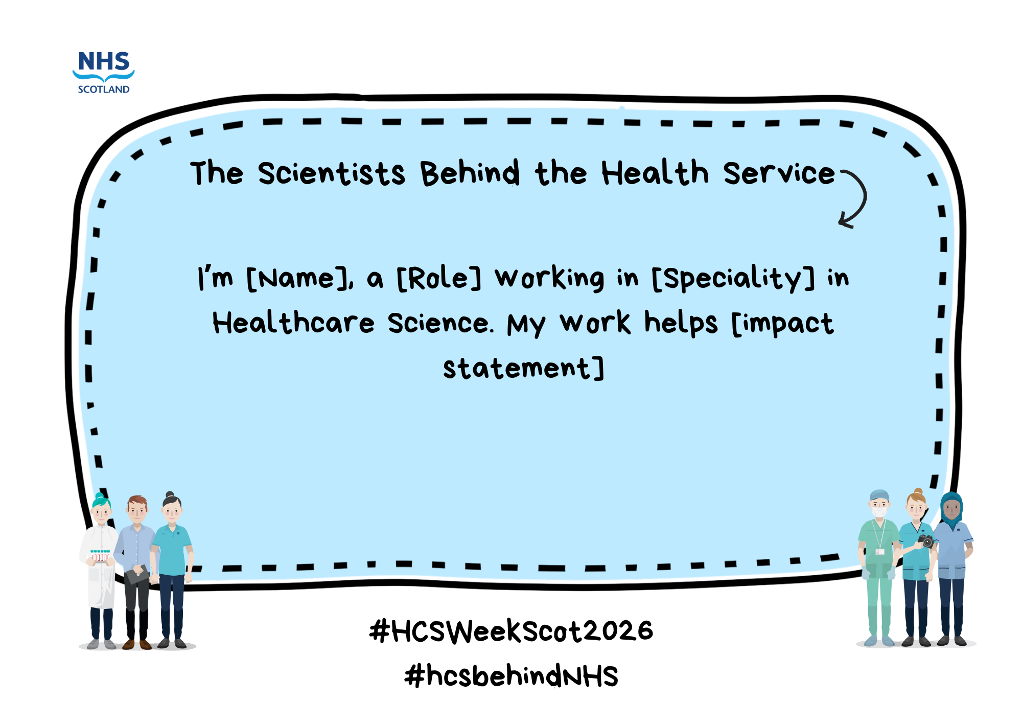 Tell your own story about why you love working in Healthcare Science. Please take photos of yourself and your colleagues with the placard and share them on social media using the hashtags #HCSWeekScot2026 #hcsbehindNHS